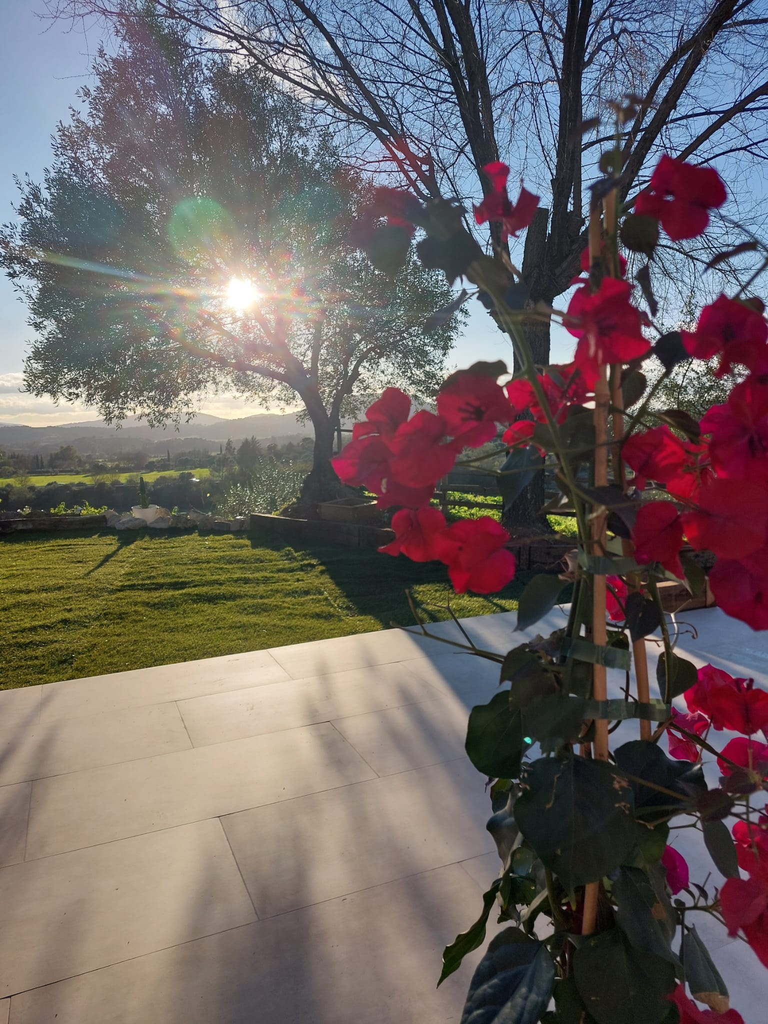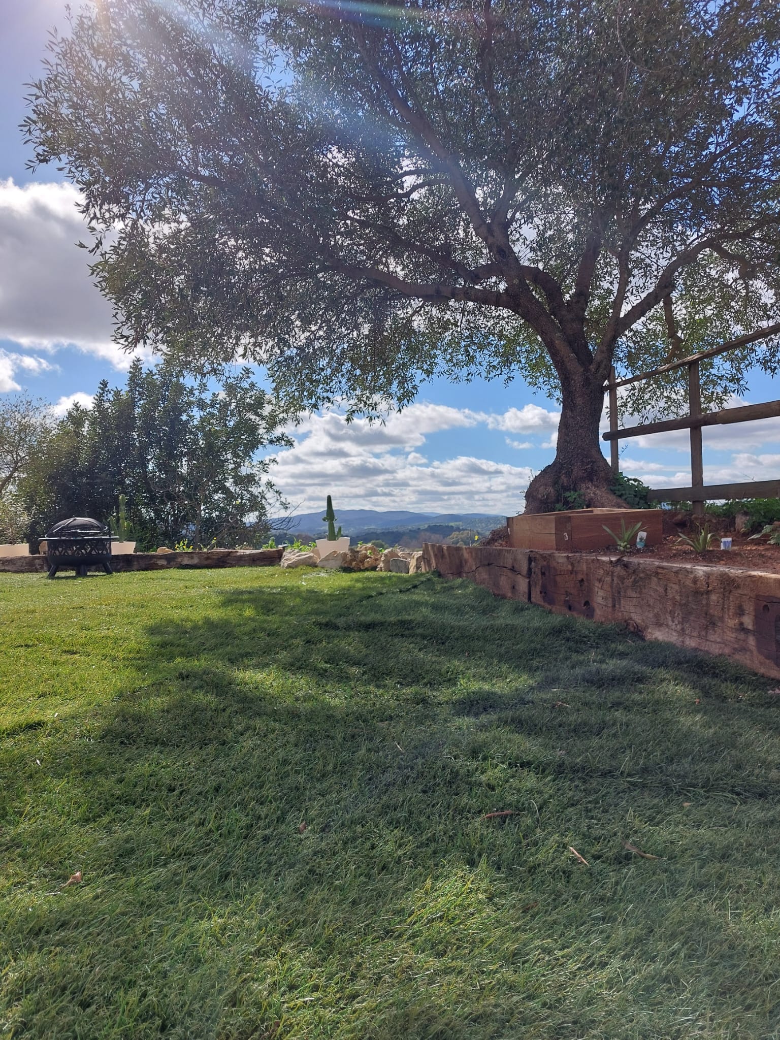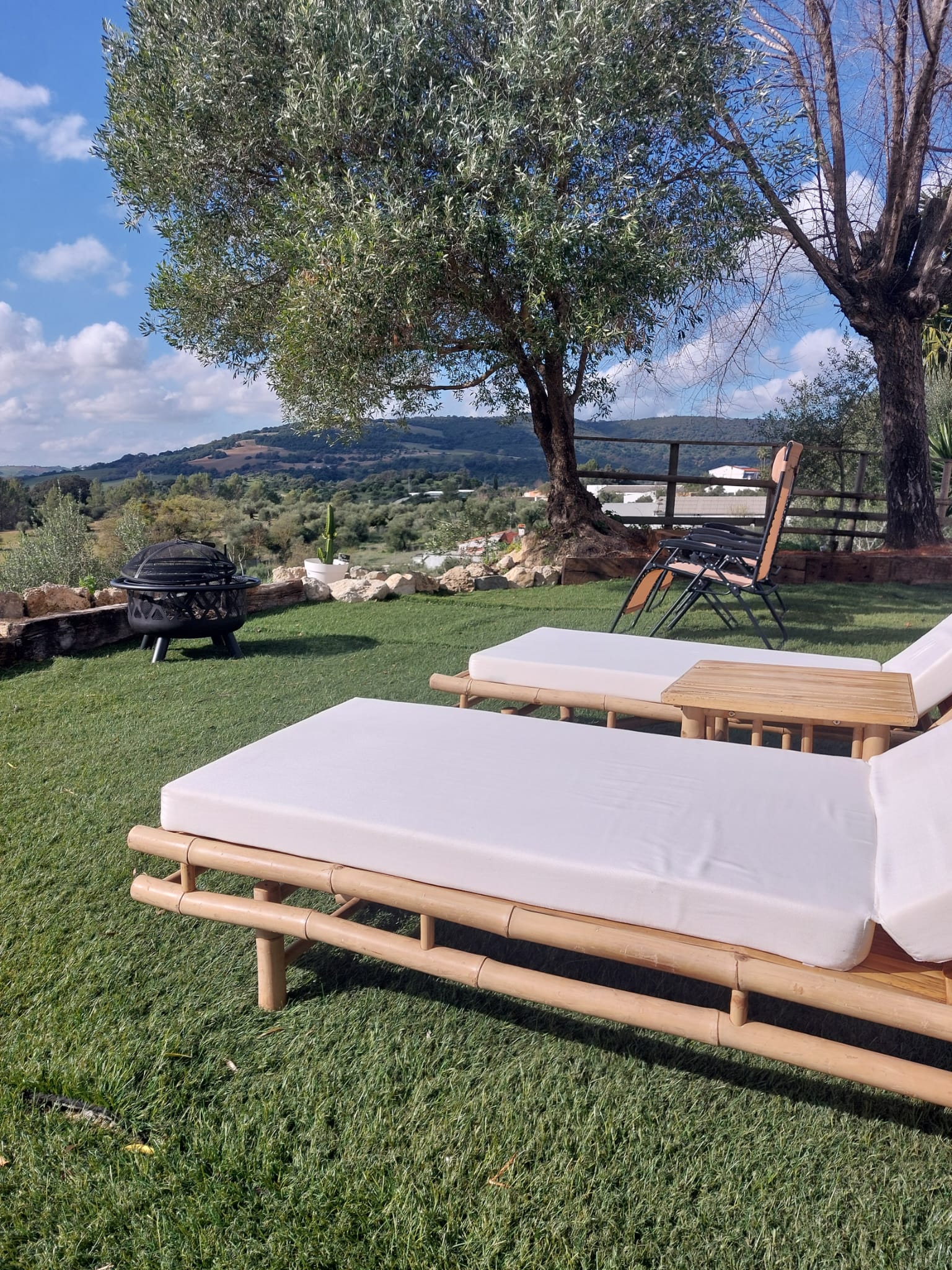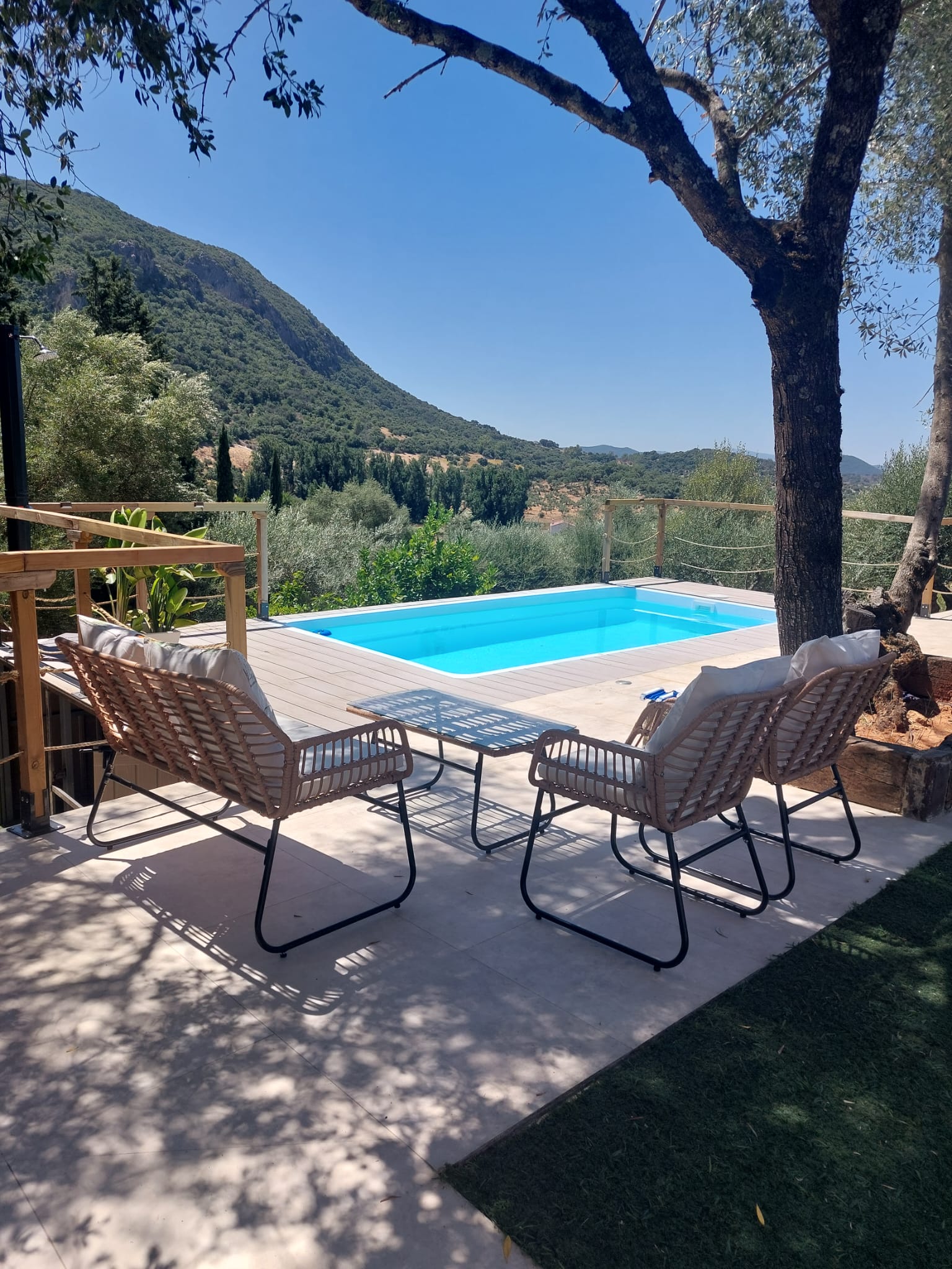 Los dos porches, uno delantero y otro trasero, ofrecen vistas únicas al atardecer, a los olivos centenarios y al paisaje montañoso que envuelve la finca.